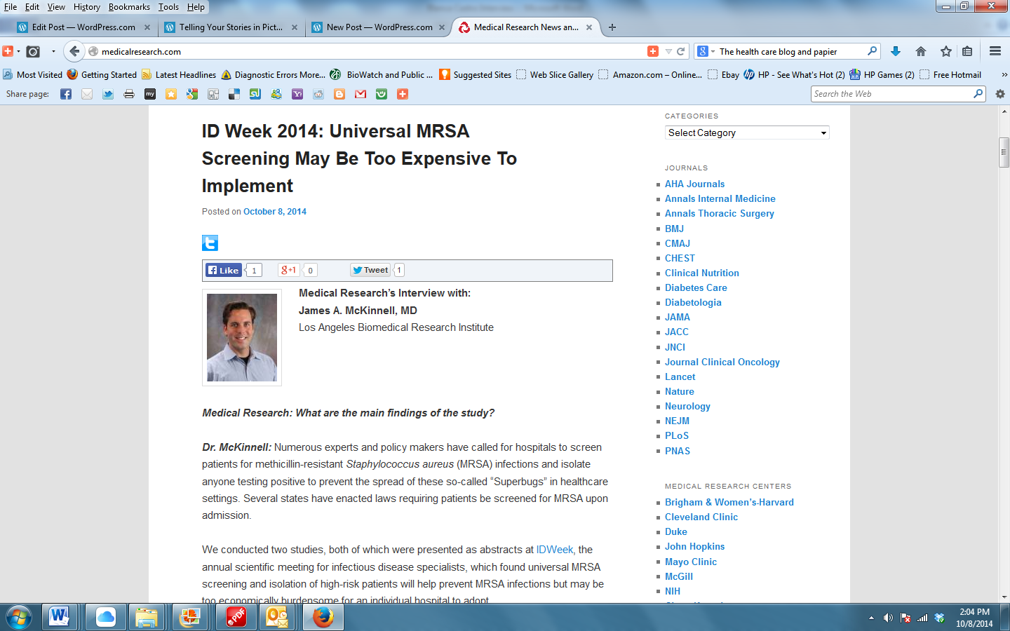 LA BioMed researcher James A. McKinnell describes the two abstract presentations on Friday about the high cost of preventing the hospital-acquired Superbug, MRSA. The preventive costs may exceed the potential savings, leading hospitals to avoid spending the money on preventive measures.